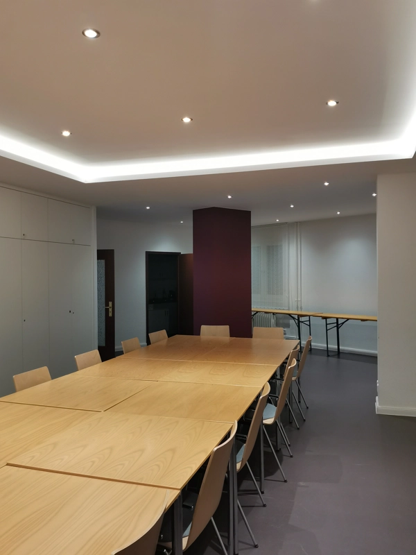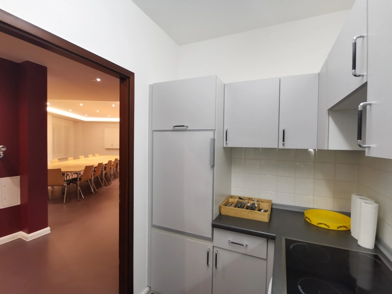 Der Raum verfügt über eine Bestuhlung für ca. 40 Personen, Toiletten und Garderoben befinden sich im Eingangsbereich.